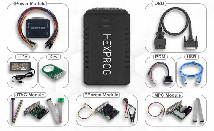 - HEX-PROG Power Module (erforderlich für Lesen/Schreiben von Motorsteuergeräten)